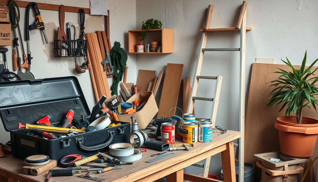 Having the right DIY tools is key for any DIY project. A good toolbox makes tasks easier and faster. For household essentials, you need a hammer, screwdrivers, pliers, and wrenches. These tools help with hanging pictures and fixing faucets.
